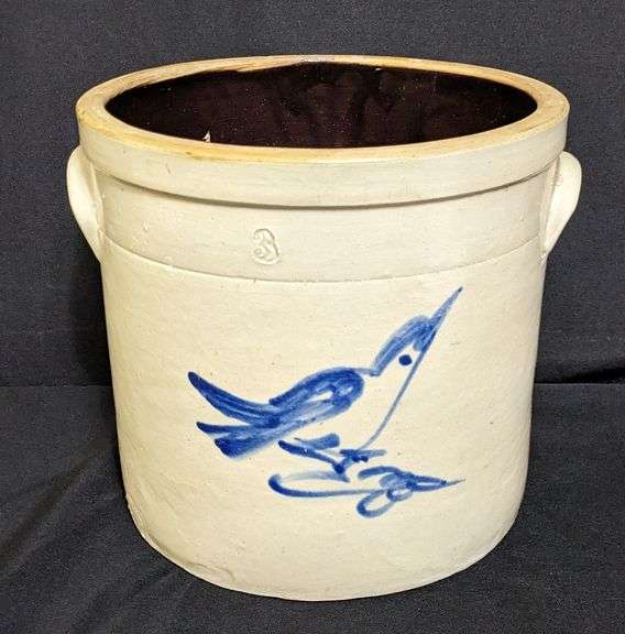 HAS A BRUISE ON ONE HANDLE. THERE IS ALSO SOME GLAZE FLAKING ON THE EXTERIOR OF THE CROCK. THIS ITEM IS GUARANTEED TO BE OLD. APPROXIMATE SHIPPING COST WILL BE $50 TO $85.
