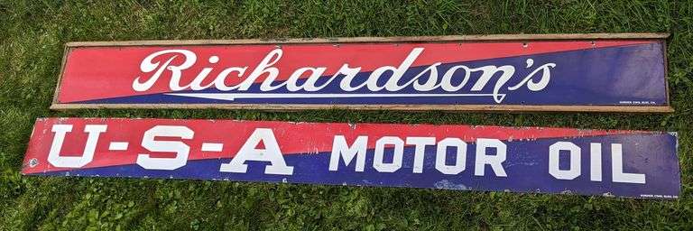 2 PORCELAIN SIGNS. 1 IS STILL MOUNTED TO ITS ORIGINAL WOOD FRAME. BOTH HAVE NICE GLOSS. BOTH SHOW SOME WEAR, PATINA AND CHIPS. THE SIGN WITH NO FRAME IS 110 X 11". THE SIGN IN THE FRAME IS 107 X 13 1/4". NO SHIPPING ON THIS ITEM. AFTER THE AUCTION THIS LOT CAN BE PICKED UP BY APPOINTMENT IN HIXTON WISCONSIN.