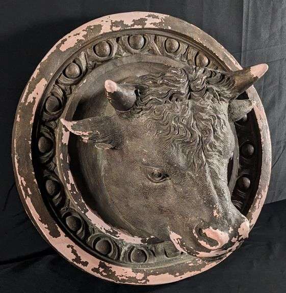 INCREDIBLE ITEM HERE FOLKS. PLASTER 3-DIMENSIONAL BULL HEAD. LIKELY HUNG AT A BUTCHER SHOP OR MEAT MARKET. 32 1/2" DIAMETER. OVERALL GREAT CONDITION. THERE IS SOME FLAKING AND PEELING PAINT. BUT THE PLASTER PART IS IN NICE CONDITION. NO MAJOR CHIPS OR CRACKS. THIS ITEM IS GUARANTEED TO BE OLD AND ORIGINAL. NO SHIPPING ON THIS ITEM. WE CAN ARRANGE FOR HAND DELIVERY WITHIN THE CONTINENTAL UNITED STATES, FOR A FEE. MINIMUM FEE $250. THE FURTHER YOU LIVE FROM WISCONSIN THE HIGHER THE COST WILL BE. AFTER THE AUCTION THIS ITEM CAN BE PICKED UP BY APPOINTMENT IN HIXTON WISCONSIN. WE ARE VERY FLEXIBLE ON PICK UP TIMES.