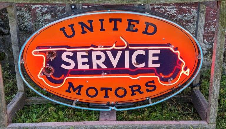 36X20". SINGLE SIDED. GREAT GLOSS. FEW SMALL CHIPS. THIS IS ONE SIDE OF A 2-SIDED NEON SIGN. THE BACK CANISTER AND THE NEON HAVE BEEN REPLACED. THE PORCELAIN SIGN ITSELF IS 100% ORIGINAL. NO SHIPPING ON THIS ITEM. AFTER THE AUCTION IT CAN BE PICKED UP BY APPOINTMENT IN HIXTON WISCONSIN.