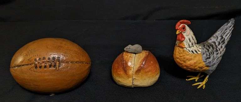 FOOTBALL, 5 1/4 X 3 3/4". BREAD, 3 1/2 X 3". CHICKEN, 5 X 5". LIGHT WEAR & PATINA. THIS ITEM IS GUARANTEED TO BE OLD. APPROXIMATE SHIPPING COST WILL BE $20 TO $25.
