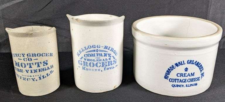ALL THREE HAVE DAMAGE. BUTTER CROCK HAS A HAIRLINE DOWN THE BACK AND 1/2 WAY ACROSS THE BOTTOM. 9 1/4 X 6 1/4". THE LARGER PITCHER IS BOTTOM MARKED BURLEY WINTER. IT IS MISSING THE HANDLE. HAS SEVERAL CHIPS AND A HAIRLINE THAT GOES FROM THE RIM TO THE BASE. THE SMALLER PITCHER IS MISSING ITS HANDLE. ALSO HAS SEVERAL CRACKS AND CHIPS. THIS ITEM IS GUARANTEED TO BE OLD. APPROXIMATE SHIPPING COST WILL BE $55 TO $85.