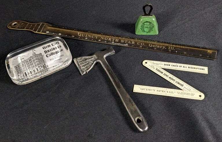 LOT 197 - COLLECTION OF QUINCY ILLINOIS ADVERTISING ITEMS SANTA CLAUS BEEL TOBACCO HATCHET GLASS PAPER WEIGHT