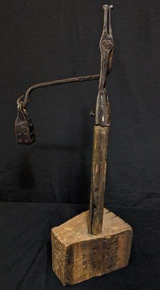 22" TALL. THE IRON PART IS ALL ORIGINAL. THE WOOD SHAFT AND BASE WERE ADDED AT SOME POINT FOR DISPLAY PURPOSES. ALTHOUGH IT WAS LIKELY MANY YEARS AGO AS THE WOOD HAS SOME GREAT PATINA. THIS ITEM IS GUARANTEED TO BE OLD. APPROXIMATE SHIPPING COST WILL BE $25 TO $35.