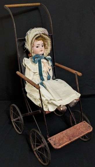 CART IS 19X12X26". IT FOLDS UP. THE DOLL IS MARKED HD 2/0 H GERMANY. SHE IS ABOUT 19" TALL. APPEARS TO BE IN GREAT CONDITION WITH PERIOD CLOTHING AND A LEATHER CLAD BODY. NO SHIPPING ON THIS ITEM. AFTER THE AUCTION THIS ITEM CAN BE PICKED UP BY APPOINTMENT IN HIXTON WISCONSIN.