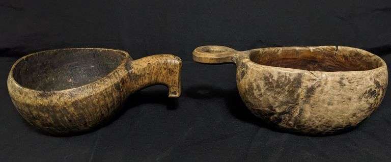 THE OVAL PIECE IS DATED 1844. 11 1/2 X 6". HAS A FEW MINOR SHORT CRACKS. THE HORSE HEAD HANDLE BOWL HAS SOME GREAT BURL COLORING. 8 1/4 X 10". SHOWS WEAR & PATINA. THIS ITEM IS GUARANTEED TO BE OLD. APPROXIMATE SHIPPING COST WILL BE $25 TO $35.