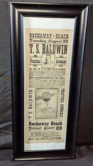 THIS PAPER POSTER HAS BEEN NICELY FRAMED. IT APPEARS TO BE ORIGINAL. THE POSTER ADVERTISES A PARACHUTE JUMP THAT WAS TO TAKE PLACE BY T.S. BALDWIN (QUINCY ILLINOIS NATIVE) IN HIS CITY OF QUINCY BALOON. THIS WAS TO TAKE PLACE AT ROCKAWAY BEACH IN QUEENS NEW YORK CITY. BALDWIN WAS THE FIRST PERSON TO EVER JUMP FROM A BALOON USING A PARACHUTE. GOOGLE WILL TELL YOU AN INTERESTING HIS ABOUT THIS MAN.